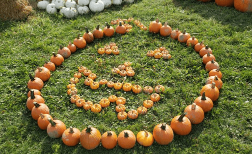 Dramatic pumpkin face drawn on your lawn in pumpkins to delight the kids and big kids aline.